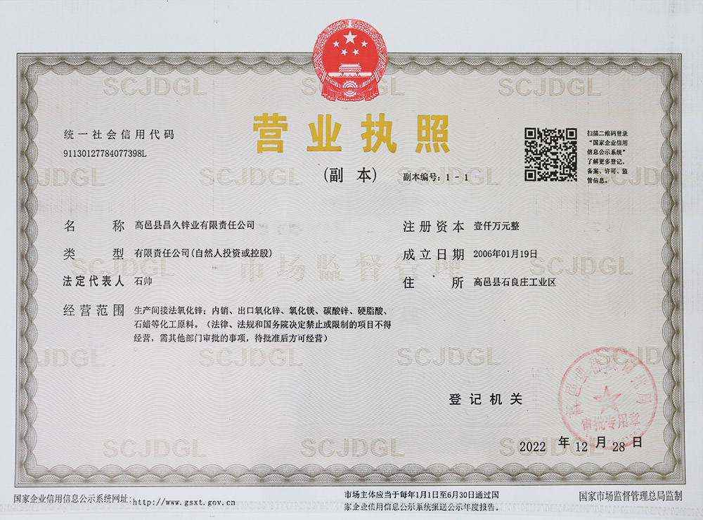 At present, it has total assets of 28 million yuan, an area of 40,000 square metres . and 130 employees (including 16 technicians). Our products include indirect process zinc oxide (99. 7%) with annual capacity of 10,000 tons, direct process zinc oxide (90% 99. 5%) , with annual 5,000 tons, and high active zinc oxide with annual capacity of 3,000 tons, Basic Zinc Carbonate with annual capacity of 3,000 tons and it is the Quality supplier of zinc oxide in Hebei province. Since 2008, the company also takes the lead in the advanced production lines introducing magnesium carbonate, magnesium oxide, stearic acid, paraffin wax,the annual output of 60,000 tons.
