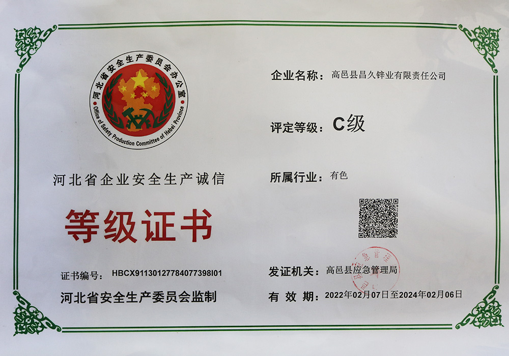 Changjiu zinc industry co., Itd has already set up the integrity management system from raw materials purchasing, raw materials detection, production process,to products detection and products leave the storehouse, already has passed IS0 9001: 2000 international quality system certification. Changjiu Company casts "CHANG JIU"brand with the management concept of"seek truth and be practical".